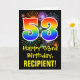 The front of this fun, colorful, and exciting birthday themed greeting card design features a large number "53" having a rainbow spectrum gradient inspired pattern. It also features the message "Happy 53rd Birthday,", and a custom recipient name. The front additionally features a colorful background pattern inspired by the look of bursting celebratory fireworks. The inside features a custom birthday greeting message, or could perhaps be cleared and left blank if a message is to be written by hand instead. A personalized birthday card like this might be a fun way to send a message in celebration of somebody’s fifty third birthday. [~Z0000442]