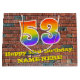 This fun and vibrant birthday themed gift bag design, inspired by graffiti, features a large number "53" with a rainbow spectrum gradient inspired pattern, along with the message "Happy 53rd Birthday,", and a customisable name. It also has a brick wall style pattern background. A colourful birthday themed giftbag like this might be a fun way to wrap a gift or present being given to somebody who is celebrating their 53rd birthday. [~Z0000522]