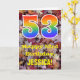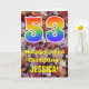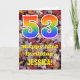 The front of this colourful, rustic, and nature-inspired birthday greeting card design features a large number "53" with a rainbow spectrum gradient inspired pattern, along with the message "Happy 53rd Birthday,", and a personalised name. The background of the front of the card features a rustic fallen autumn leaves pattern. The inside features a personalised birthday greeting message, or could perhaps be cleared and left blank if a message is to be written by hand instead. A personalised birthday card like this might be a fun way to send a message in celebration of somebody’s fifty third birthday. [~Z0000384]