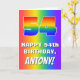 The front of this vibrant and cheerful birthday themed greeting card design features a large number “54” having a rainbow spectrum inspired gradient pattern. It also features the message “HAPPY 54th BIRTHDAY,”, and an editable name. The background of the front also has a fun multicolored rainbow spectrum gradient pattern. The inside has a custom birthday greeting message, or could perhaps be cleared and left blank if a message is to be written by hand instead. An upbeat, customisable birthday greeting card like this might be a fun way to deliver a birthday greeting message to somebody who is celebrating their fifty-fourth birthday. [~Z0000570]