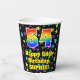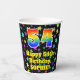 This fun and colourful birthday paper cup design features a large number “54” having a rainbow spectrum gradient inspired pattern. It also features the message “Happy 54th Birthday,”, and an editable name. The background features a multicolored pattern featuring many star shapes with different colours and sizes. Colourful, vibrant paper cups like this might be fun to have at a birthday party being held in celebration of somebody’s fifty fourth birthday. [~Z0000540]