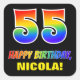 This colourful, cheerful, and fun birthday-themed sticker design features a large number "55" and the message "HAPPY BIRTHDAY,", both coloured with a rainbow spectrum gradient inspired pattern, along with a bold yellow personalised name. The background is coloured black. Fun stickers this might be used when wrapping a gift or present in honour of somebody’s 55th birthday, or perhaps maybe be given out to the guests at a birthday celebration. [~Z0000480]