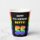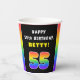 This fun and joyful birthday-themed paper cup design features the number “55“ having a vibrant rainbow spectrum inspired gradient pattern, along with the message “HAPPY 55th BIRTHDAY,”, and an editable recipient name. Cheerful birthday themed paper cups like this might be used at a birthday party in celebration of somebody’s 55th birthday. [~Z0000639]