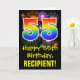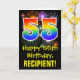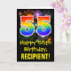 The front of this exciting, colorful, and fun birthday-themed greeting card design features a large number "55" with a rainbow spectrum gradient inspired pattern, along with the message "Happy 55th Birthday,", and a personalized recipient name. The front additionally has a colorful background pattern inspired by the appearance of bursting celebratory fireworks. The inside features a personalized birthday greeting message, or could perhaps be cleared and left blank if a message is to be written by hand instead. A customizable birthday card like this might be a fun way to celebrate somebody’s fifty fifth birthday. [~Z0000442]