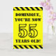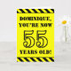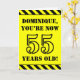 The front of this fun and attention-grabbing birthday-themed greeting card design features an editable name and the message "YOU’RE NOW 55 YEARS OLD!" in black stencil style text on a yellow colored background. The front also features an eye-catching yellow and black stripes pattern at the top and bottom edges. The inside features a customized birthday greeting message, or could perhaps be cleared and left blank if a message is to be written by hand instead. A personalized birthday card like this might be a fun way to send a message in celebration of somebody’s fifty fifth birthday. [~Z0000413]