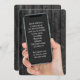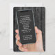 Cellphone in a hand on dark grey rustic wood for a 55th birthday party.