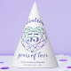 Alexandrite 55 years wedding anniversary party hats. The design features purple blue script typography on white with your names and the words of celebration 55 years of love in script style font and a line art heart purple green alexandrite style graphic gemstone. Personalise with your names and anniversary wedding dates. The 55th wedding anniversary is associated with the gemstone Alexandrite and the heart symbolises love. Other matching amethyst wedding anniversary items available. Line art and design by www.mylittleeden.com on zazzle.