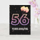 Party balloons and confetti on black background with the neon number 56 for a 56th birthday.