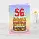 This fun and cheerful birthday-themed greeting card design features a cartoon-style depiction of a three-tier birthday cake having number-shaped candles on top showing the age “56“, along with the message “HAPPY 56TH BIRTHDAY,”, and a customisable recipient name. The background of the front features a multicolored pastel rainbow spectrum inspired gradient pattern. The inside features a customised birthday greeting message, or could perhaps be cleared and left blank if a message is to be written by hand instead. A joyful, personalised birthday greeting card like this might be a fun way to deliver a birthday greeting message to somebody who is celebrating their fifty-sixth birthday. [~Z0000625]