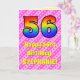 The front of this fun and cheerful 56th birthday themed greeting card design features a large number "56" having a colourful pattern inspired by the look of a rainbow spectrum. It also features the message "Happy 56th Birthday,", and an editable recipient name. The background of the front features a light pink and dark pink stripes pattern containing loving pink heart shapes. The inside features an editable birthday greeting message, or could perhaps be cleared and left blank if a message is to be written by hand instead. A personalised birthday card like this might be a fun way to acknowledge somebody’s fifty sixth birthday. [~Z0000416]