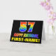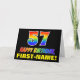 The front of this colourful, cheerful, and fun birthday-themed greeting card design features a large number "57" and the message "HAPPY BIRTHDAY,", both coloured with a rainbow spectrum gradient inspired pattern, along with a bold yellow personalised recipient name. The front also features a simple, plain, black coloured background. The inside features a custom birthday greeting message, or could perhaps be cleared and left blank if a message is to be written by hand instead. A colourful customisable birthday card like this might be a fun way to send a message celebrating somebody’s fifty seventh birthday. [~Z0000472]