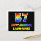 The front of this fun, cheerful, and colourful birthday-themed postcard design features a large number "57" and the message "HAPPY BIRTHDAY,", both having a rainbow spectrum gradient inspired pattern colouring, along with a bold yellow personalised recipient name. The front also features a simple black coloured background. The back of the postcard features a customisable birthday greeting message, or could perhaps be cleared and left blank if a message is to be written by hand instead. A vibrant customisable birthday postcard like this might be a fun way of acknowledging somebody’s fifty seventh birthday. [~Z0000474]