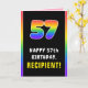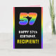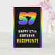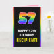 This fun and joyful birthday-themed greeting card design features a big number “57“ having a multicolor rainbow spectrum inspired gradient pattern, along with the message “HAPPY 57th BIRTHDAY,”, and a personalised recipient name. The inside features a customised birthday greeting message, or could perhaps be cleared and left blank if a message is to be written by hand instead. A cheerful, customisable birthday greeting card like this might be used to celebrate somebody’s fifty-seventh birthday. [~Z0000636]