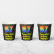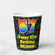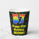 This cheerful and fun music-themed birthday paper cup design features a large number “57” having a rainbow spectrum gradient inspired pattern. It also features the message “Happy 57th Birthday,”, and an editable name. The background features a colourful pattern having music notes and symbols of various colours and sizes. Colourful, vibrant paper cups like this might be fun to have at a birthday party being held to honour somebody’s 57th birthday. [~Z0000541]