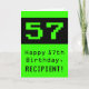 This geeky and fun birthday greeting card design features a large green classic computer gaming style number "57" on the front. It also features the birthday greeting message "Happy 57th Birthday,", and a custom name. The inside features a custom birthday greeting message, or could perhaps be cleared and left blank if a message is to be written by hand instead. A silly birthday greeting card like this might be used to send birthday wishes to somebody who is celebrating their fifty seventh birthday and who enjoys retro video gaming. [~Z0000430]