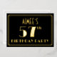 The front of this vintage-look fifty-seventh birthday celebration foil invitation features an editable name, a large art deco look inspired number “57th”, the message “BIRTHDAY PARTY”, and a border pattern consisting of lines. The front also has a black-coloured background by default, but it can be customised to a different colour if desired. The back features personalised details about the event, such as the date, time, venue, and any other information that may be important. Elegant, luxurious, customisable invitations like these might be used to invite guests to a birthday party being held to honour somebody’s 57th birthday. [~Z0000591]