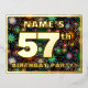 The front of this exciting fifty-seventh birthday party foil invitation postcard design features an editable name, a large number “57th”, the message “BIRTHDAY PARTY!”, and a border. The background of the front has an eye-catching, multicolored bursting celebratory fireworks-inspired pattern. The back features personalised details about the event, such as the date, time, location, and any other information that may be relevant. Customised invitations like these might be a fun way to let guests/attendees know about a birthday gathering being held to celebrate somebody’s 57th birthday. [~Z0000609]