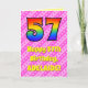 The front of this festive and cheerful 57th birthday-themed greeting card design features a large number "57" having a colourful pattern inspired by the look of a rainbow spectrum. It also features the message "Happy 57th Birthday,", followed by a customisable recipient name. The background of the front features a fun pattern of light pink and dark pink stripes containing loving pink heart shapes. The inside features a custom birthday greeting message, or could perhaps be cleared and left blank if a message is to be written by hand instead. A personalised birthday card like this might be a fun way to send a message in celebration of somebody’s fifty seventh birthday. [~Z0000416]