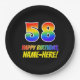 This colourful, fun, and cheerful birthday-themed paper plate design features a large number "58" and the message "HAPPY BIRTHDAY,", both having a rainbow spectrum gradient inspired pattern colouring, along with a bold yellow customisable name. The background is coloured black. Fun, editable paper plates like this might be used at a party being held to celebrate somebody’s 58th birthday. [~Z0000488]