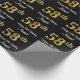 This sophisticated, stylish, and luxurious birthday wrapping paper design features a large ordinal number “58th” having a faux/imitation gold-like look, along with the birthday greeting message “Happy 58th Birthday,” and an editable recipient name in a script-style font. The background is coloured black. Birthday themed wrapping paper like this might be used when giving a gift or present in celebration of somebody’s 58th birthday. [~Z0000515]