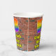 This fun and vibrant urban street art and graffiti themed birthday paper cup design features a large number “58” having a colourful rainbow spectrum gradient inspired pattern. It also features the message “Happy 58th Birthday,”, and a custom name. The background features a brick wall pattern. Vibrant, colourful paper cups like this might be fun to use at a birthday celebration/party being held to celebrate somebody’s 58th birthday. [~Z0000543]