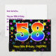 The front of this colourful, exciting, and fun birthday themed postcard design features a large number "58" having a rainbow spectrum gradient inspired pattern. It also features the message "Happy 58th Birthday,", and a custom recipient name. The front additionally features a vibrant and colourful star shapes background pattern. The back features a personalised birthday greeting message, or could perhaps be cleared and left blank if a message is to be written by hand instead. A customisable birthday postcard like this might be a fun way to send a message celebrating somebody’s fifty eighth birthday. Postcards like this might also be used to invite guests to a birthday party being held for somebody who is turning 58 years old. [~Z0000447]