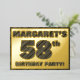 The front of this bold fifty-eighth birthday party/celebration foil invitation card features a personalised name, a large number “58th”, the message “BIRTHDAY PARTY!”, and a border, all featuring a rustic, yet elegant, faux wood grain appearance inspired pattern. The back features personalised details about the event, such as the date, time, venue/location, and any other useful information. Editable invitations like these might be used to invite guests to a birthday party being held to honour somebody’s 58th birthday. [~Z0000595]