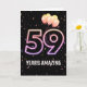 Party balloons and confetti on black background with the neon number 59 for a 59th birthday.