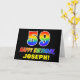 The front of this cheerful, fun, and colourful birthday themed greeting card design features a large number "59" and the message "HAPPY BIRTHDAY,", both coloured with a rainbow spectrum gradient inspired pattern, along with a bold yellow custom recipient name. The front also has a simple black coloured background. The inside has a custom birthday greeting message, or could perhaps be cleared and left blank if a message is to be written by hand instead. An exciting personalised birthday card like this might be a fun way of celebrating somebody’s fifty ninth birthday. [~Z0000472]