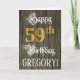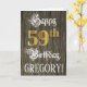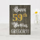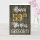 The front of this luxurious and formal birthday greeting card design features the message “Happy 59th Birthday,”, along with a personalised recipient name. Some of the message is in fancy script-style text, the large number “59th” features a faux/imitation gold-inspired look pattern, and the background has a faux/imitation woodgrain-inspired pattern. The inside has a custom birthday greeting message, or could perhaps be cleared and left blank if a message is to be written by hand instead. An elaborate, personalised birthday greeting card like this might be used to celebrate somebody’s fifty-ninth birthday. [~Z0000561]