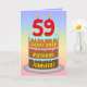 This colourful and upbeat birthday greeting card design features a cartoon-style depiction of a three-tier birthday cake having numeral-shaped candles on top showing the number “59“, along with the message “HAPPY 59TH BIRTHDAY,”, and a custom recipient name. The background of the front features a multi-colour pastel rainbow spectrum inspired gradient pattern. The inside features an editable birthday greeting message, or could perhaps be cleared and left blank if a message is to be written by hand instead. A fun, customisable birthday greeting card like this might be used to celebrate somebody’s fifty-ninth birthday. [~Z0000625]