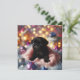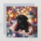 5.25" x 5.25 Holiday flat card with an adorable black pug puppy nestled in a cosy blanket, happily surrounded by colourful ornaments!