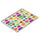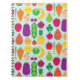 A pattern of happy colourful fruit and vegetables on a blue background, including a peach, banana, pineapple, watermelon, pear, cherries, radish, aubergine (eggplant), brussels sprout, peas, radish and red pepper (bell pepper).