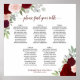 This beautiful 5 table wedding seating chart has space for 50 guests at 5 tables with 10 seats at each table. It features a rustic boho chic floral design with hand painted watercolor roses in shades of burgundy, red, and blush pink. The flowers are interspersed with eucalyptus leaves, greenery, and garden foliage. The elegant script calligraphy title adds elegance and style, and there is space for the names of the couple and wedding date below.