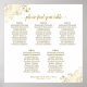 This 5 table wedding seating chart will help your guests find the right table at your reception. The design is both simple and elegant with gold text on a white background and lacy floral filigree in the corners. The title reads "please find your table" in an elegant script calligraphy. Sophisticated and chic. Includes table assignments for 50 guests with 10 seats per table.