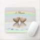 Mousepad with my design of two wooden hearts floating on the water under a rainbow. Customisable text says "5 Years".