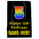 This colourful, exciting, and fun birthday themed giftbag design features a large number "5" with a rainbow spectrum gradient inspired pattern, along with the message "Happy 5th Birthday,", and a custom recipient name. The background is coloured black. A gift bag like this might be a fun way of wrapping a birthday present or gift being given to somebody who is celebrating their 5th birthday. [~Z0000512]