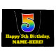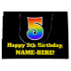 This fun and vibrant birthday gift-bag design features a large number "5" having a rainbow spectrum gradient inspired pattern. It also features the message "Happy 5th Birthday,", and a custom name. The background is coloured black. A gift bag like this might be a fun way of wrapping a birthday present or gift being given to somebody who is celebrating their 5th birthday. [~Z0000521]