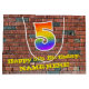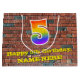 This vibrant and colourful birthday themed gift bag design, inspired by urban art and graffiti, features a large number "5" with a rainbow spectrum gradient inspired pattern, along with the message "Happy 5th Birthday,", and a personalised name. It also has a brick wall style pattern background. A gift-bag like this might be used when wrapping gifts being given to somebody in celebration of their 5th birthday. [~Z0000522]