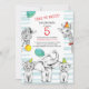 5th birthday invitation with funny cute animal illustrations drawn in pencil sketch style.