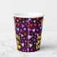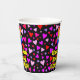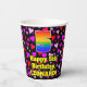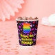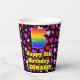 This fun and happy birthday paper cup design features a large number “5” with a rainbow spectrum gradient inspired pattern, along with the message “Happy 5th Birthday,”, and a custom name. The background features a pattern of purple, pink, and red heart shapes of various sizes. Cheerful, happy paper cups like this might be fun to have at a birthday celebration being held to honour somebody’s 5th birthday. [~Z0000548]