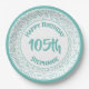 This over-the-hill design has a modern teal and white random number pattern with milestone number 105 repeated in varied sizes and angles for an all-over print. There is a white circle in the centre for your text, and teal and white rings around the rim.