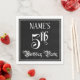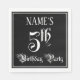 This elaborate and elegant birthday themed paper napkin design features a personalized name and the message “5th Birthday Party”. The large number “5th” and the words “Birthday Party” are in fancy script-style text, and the background is colored black by default (although it can be customized). Opulent, elaborate paper napkins like this might be used at a birthday party/celebration being held to celebrate somebody’s fifth birthday. [~Z0000563]
