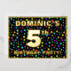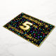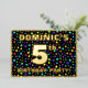 The front of this exciting fifth birthday celebration foil invitation card design features an editable name, a large number “5th”, the message “BIRTHDAY PARTY!”, and a border. The background of the front has a vibrant, multicolored stars pattern. The back features personalized details about the event, such as the date, time, place/venue, and any other important information. Customizable invitations like these might be a fun way to invite attendees/guests to a birthday gathering being held to celebrate somebody’s 5th birthday. [~Z0000600]