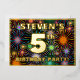 The front of this fun and exciting fifth birthday celebration foil invitation card design features a personalised name, a large number “5th”, the message “BIRTHDAY PARTY!”, and a border. The background of the front has a bold, multicolored pattern that resembles bursting celebratory fireworks. The back features personalised details about the event, such as the date, time, place, and any other information that may be relevant. Personalised invitations like these might be a fun way to invite attendees to a birthday party being held to celebrate somebody’s 5th birthday. [~Z0000602]