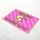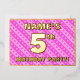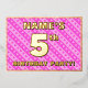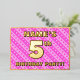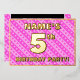 The front of this joyful and loving fifth birthday party foil invitation card design features an editable name, a large number “5th”, the message “BIRTHDAY PARTY!”, and a border. The background of the front has an upbeat dark pink and light pink stripes pattern containing heart shapes. The back features personalised details about the event, such as the date, time, venue, and any other relevant information. Customised invitations like these might be a fun way to invite guests to a birthday party/gathering being held to celebrate somebody’s 5th birthday. [~Z0000603]