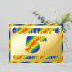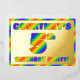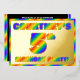 The front of this eye-catching fifth birthday party foil invitation card features a customisable name, a large number “5th”, the message “BIRTHDAY PARTY!”, and a border, all featuring a fun, colourful, rainbow spectrum inspired gradient pattern. The back features personalised details about the event, such as the date, time, venue, and any other important information. Upbeat, exciting, personalised invitations like these might be used to invite guests to a birthday gathering being held to honour somebody’s 5th birthday. [~Z0000593]