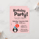 5th Birthday party invitations with funny penguin cartoon. Custom invites for kids birthdays and other fun occasions. Personalizable announcement text, age number and background colour. Girlie pink background with white polka dot pattern. Childrens fifth Birthday template. Age specific, for five year old girl.