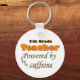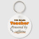 Een sleutelhanger met oranje en bruine letters met de tekst Leraar door Cafeïne. Leuk voor iemand met het beroep van Leraar. als plaatje een bliksem afgebeeld.