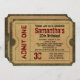 Ticket Invitations, Gold vintage antique style. customise with your party info. Makes a great, unique invite for any occasion! Styled to resemble a real admission ticket with faux cutouts and faux perforated sides, this nostalgic and fun invite is great for a birthday party at any age! Aged-look parchment style background pattern with with black and burgundy lettering in a grungy style font.